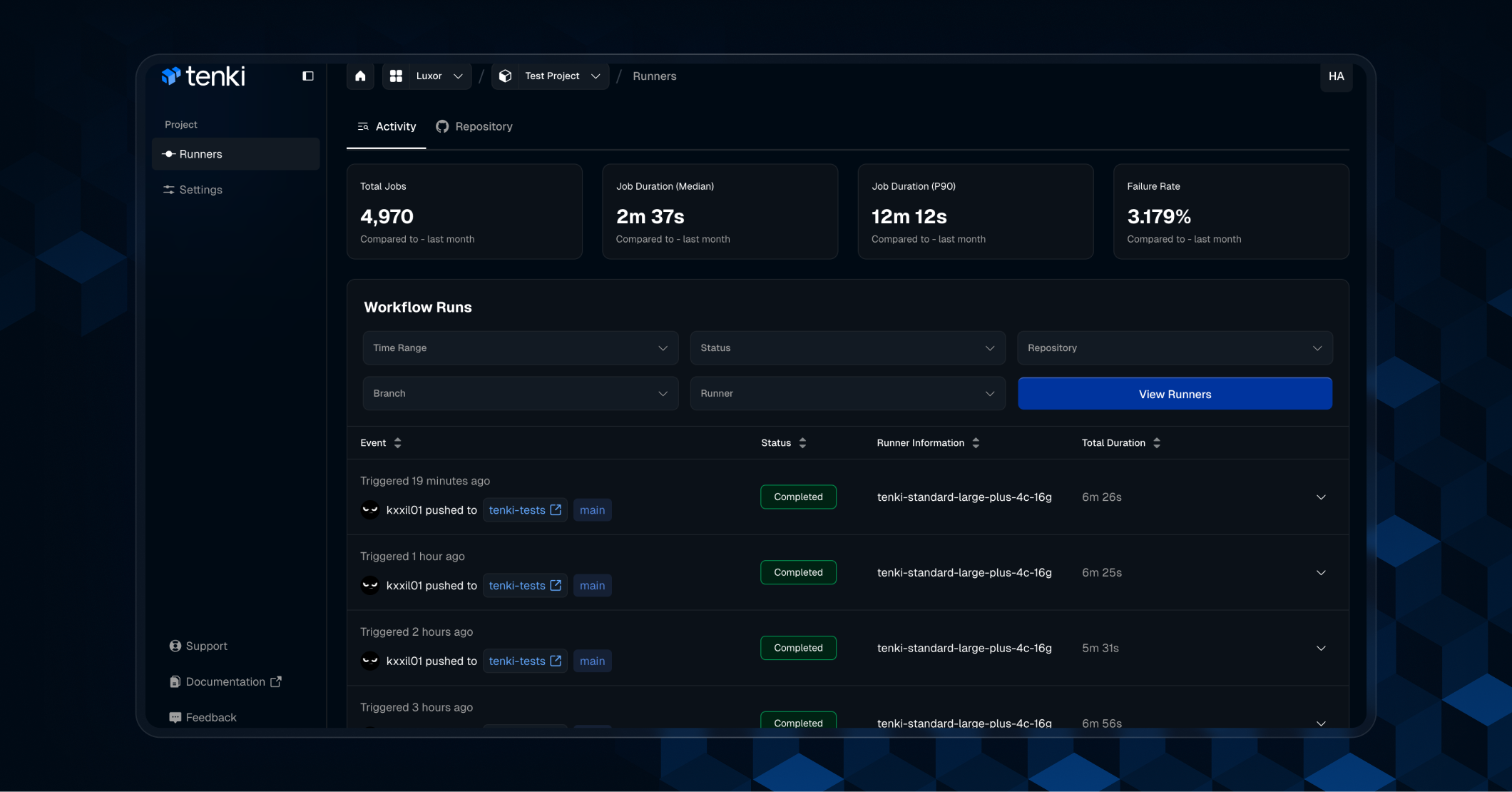 Runners: Introducing Tenki’s first core capability our high-performance, cost-effective alternative to GitHub Runners. Built for speed and usability, with a streamlined onboarding experience and a redesigned dashboard that makes filtering jobs and workflows simple and intuitive.