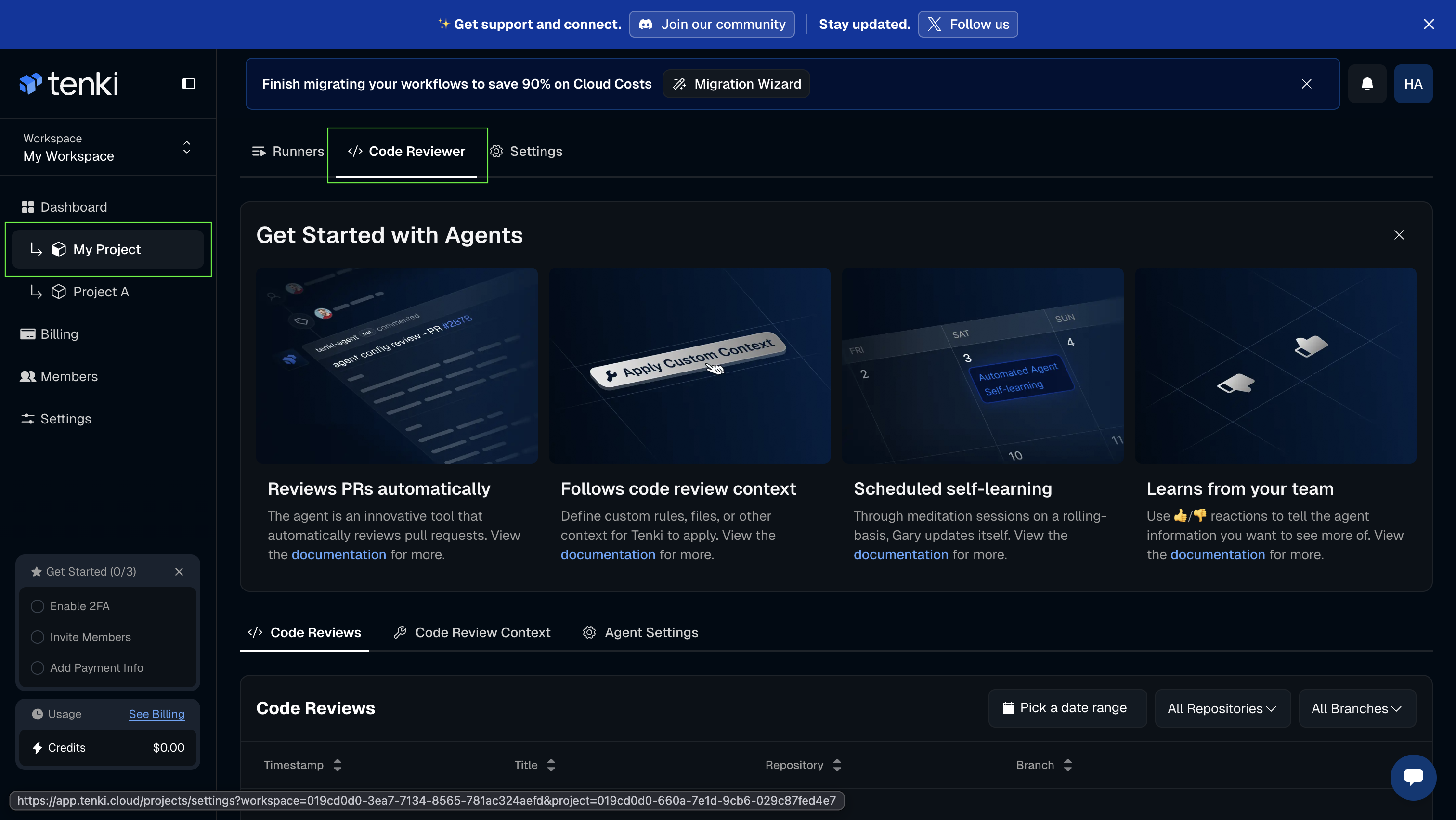 Next step will be to select your project and access the Tenki Code Reviewer tab.