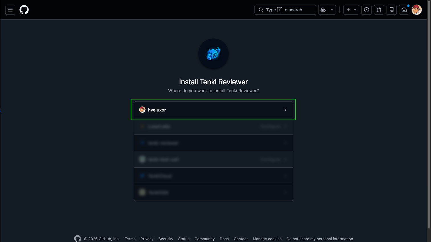 Next step will be to connect your GitHub Organization to your Workspace by installing the Tenki Reviewer GitHub application.
