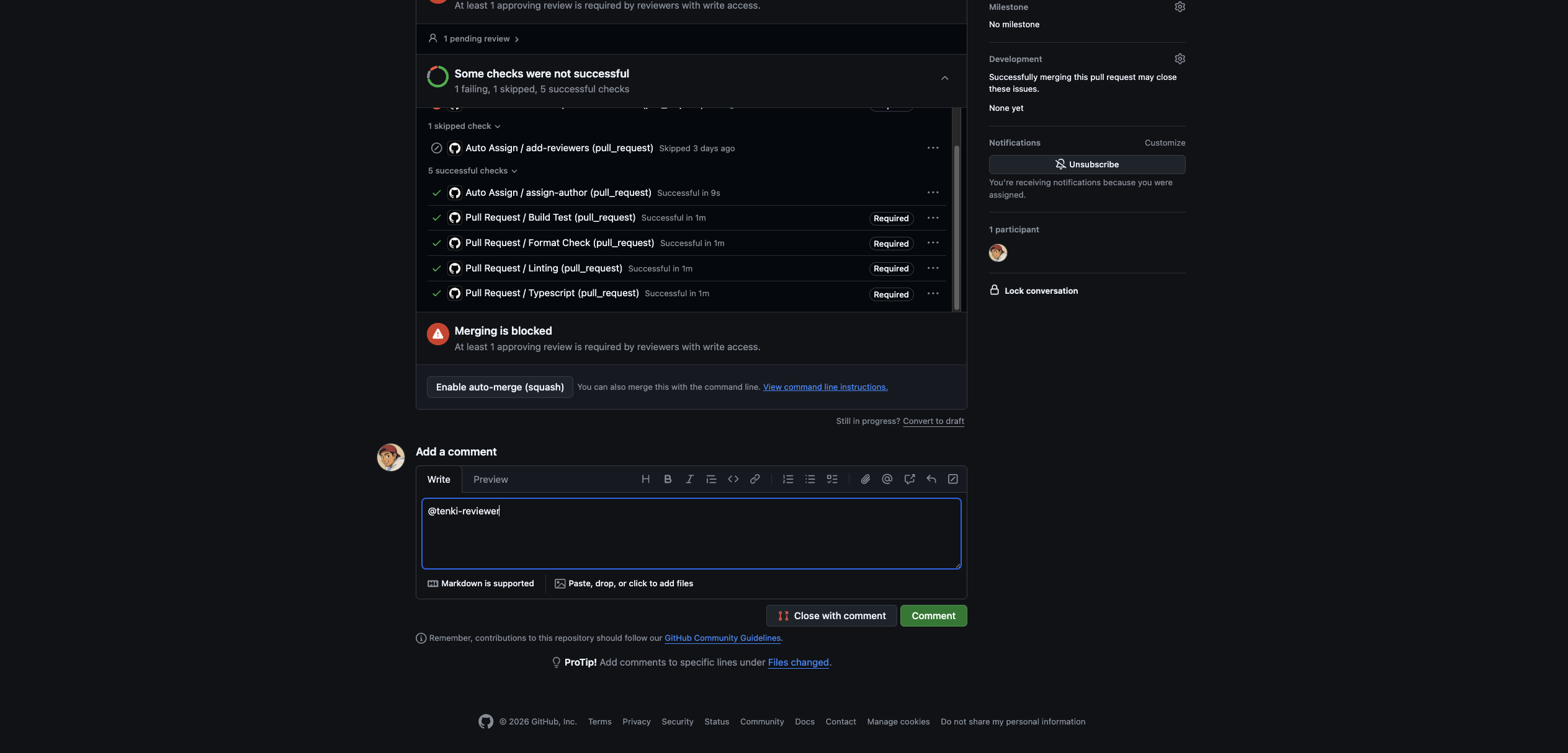 Perfect, youβre all set! π. There are now two ways to trigger the Tenki Code Reviewer.