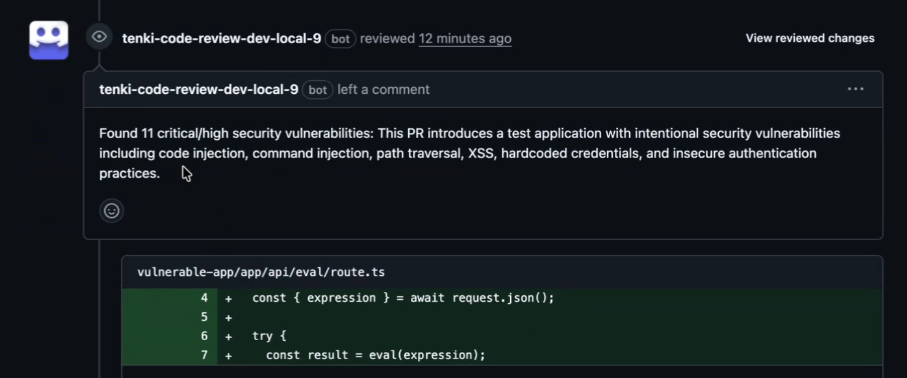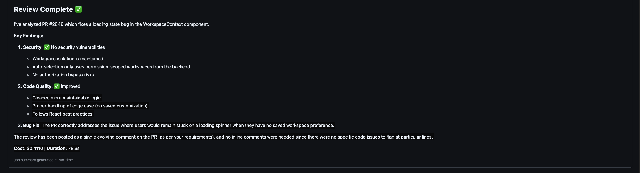 - Security risk assessment: An explicit security assessment of the PR. Only high-confidence, PR-fixable security issues are reported.